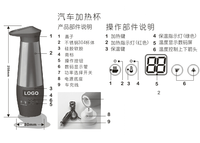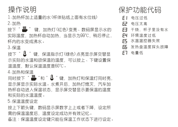 特點: 數(shù)字溫度顯示,采用厚膜加熱技術,顯著提升加熱性能,雙層不銹鋼杯體和真空保溫技術,降低熱量耗散速度,外觀采用人體工學和實用相結(jié)合的設計。