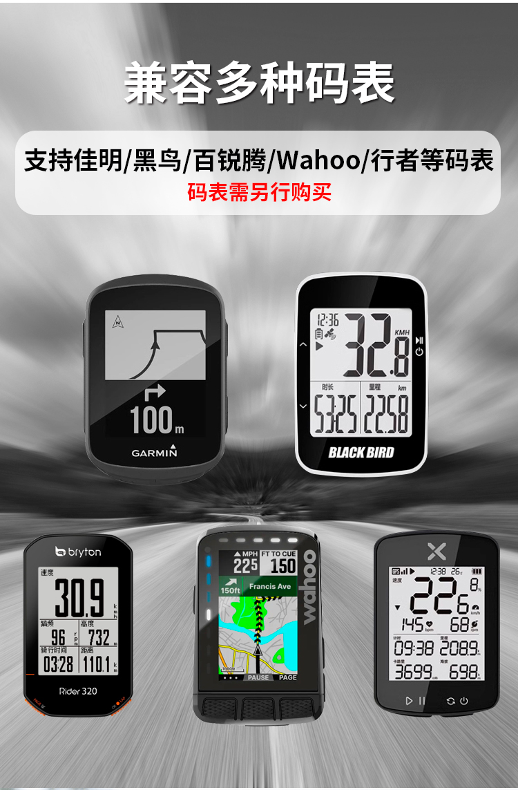 支持碼表:GARMIN全系列(兼用行者/黑鳥/iGPS等),貓眼全系列,WAHOO系列,百銳騰系列