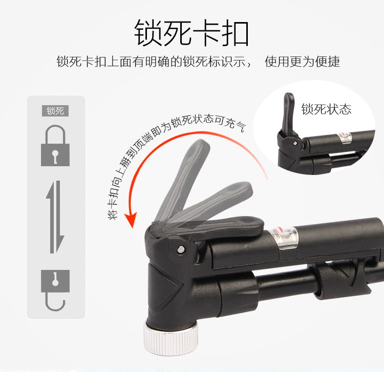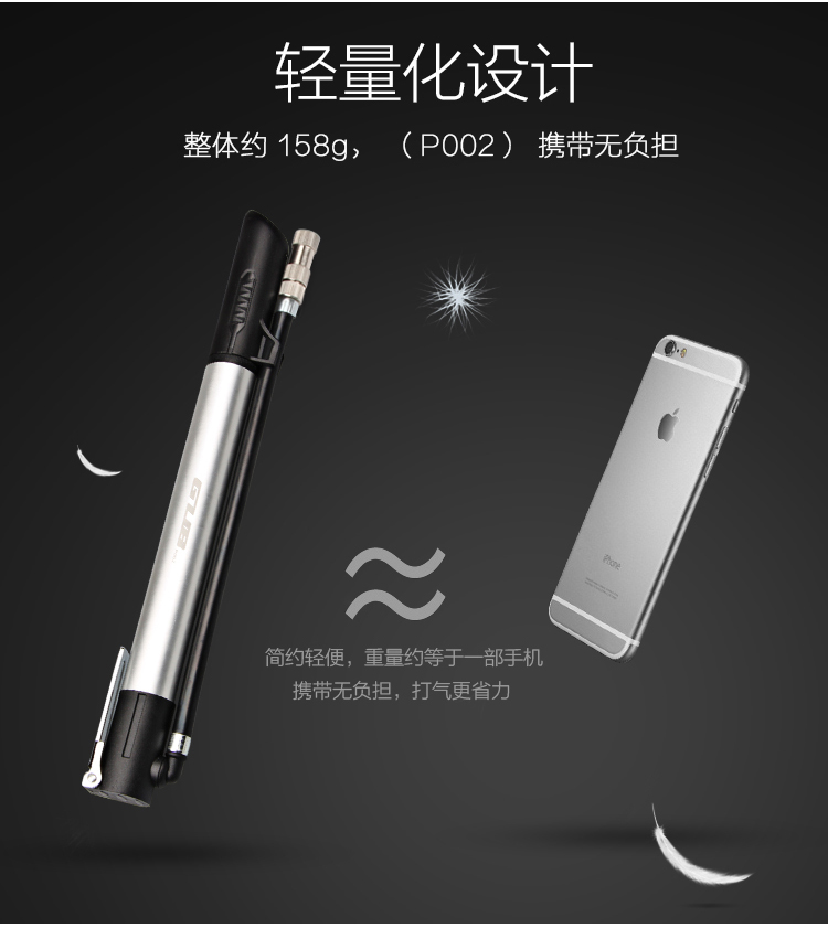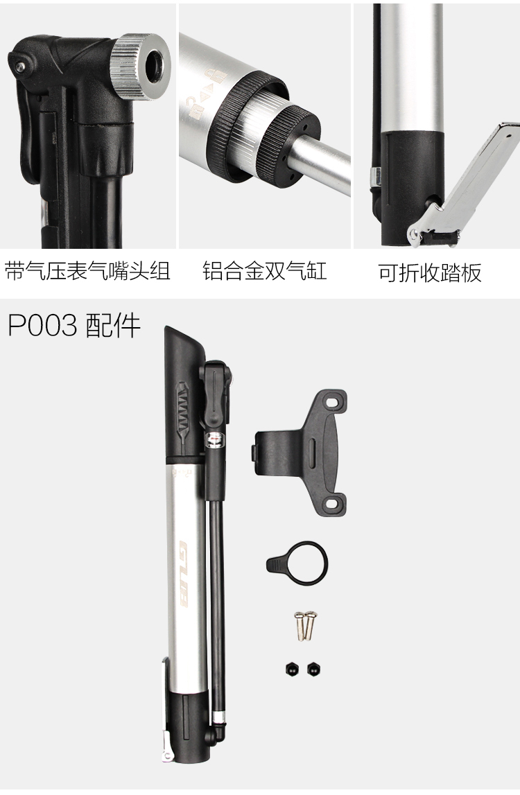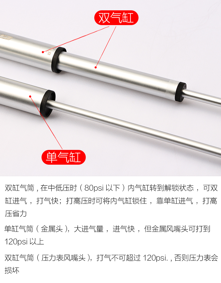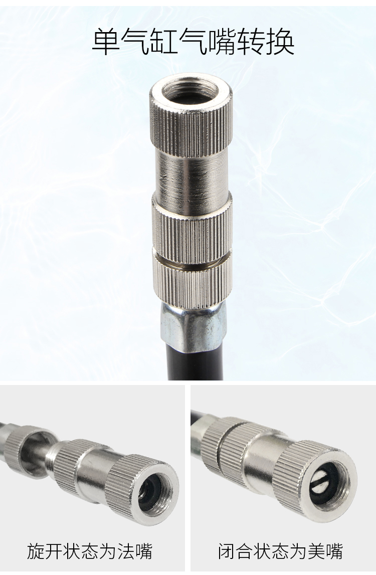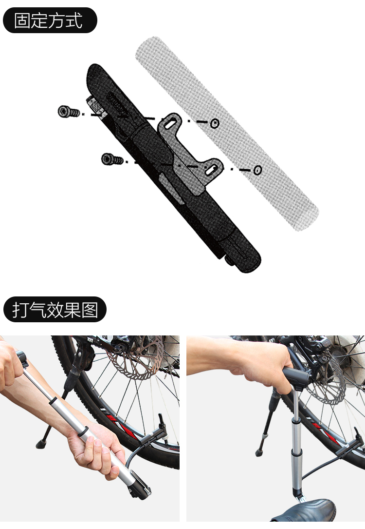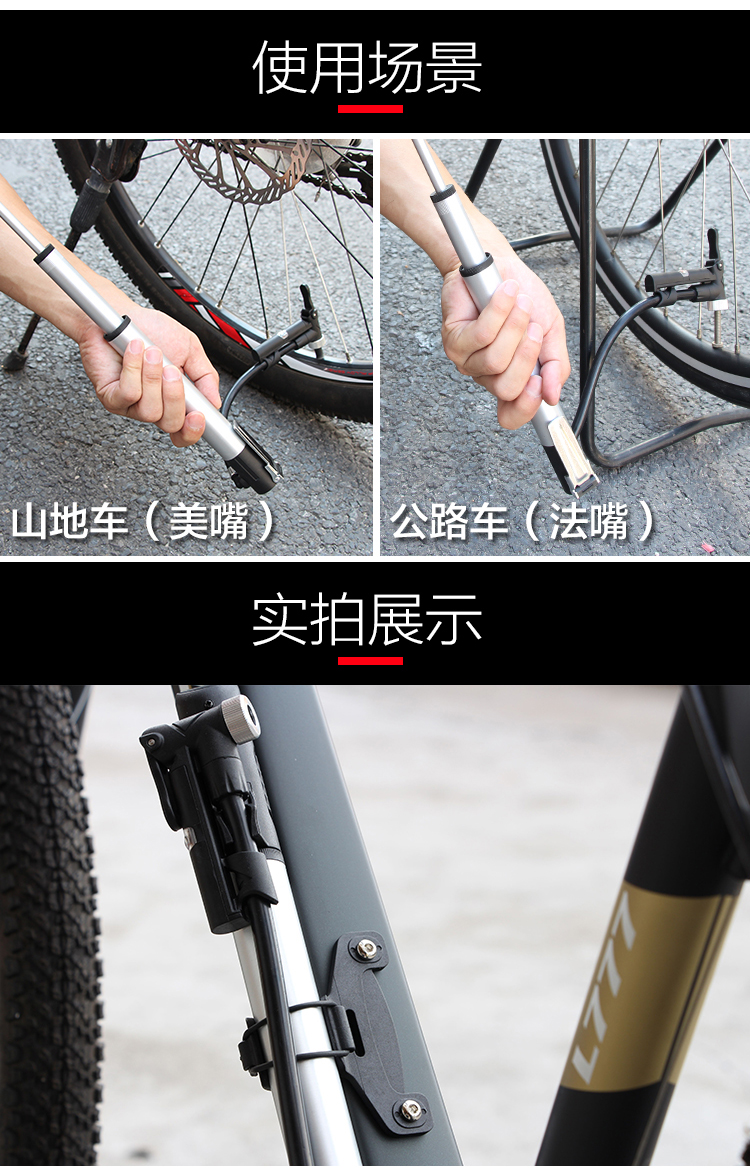 特點(diǎn):鋁合金氣缸,體積小不占地方,美嘴法嘴兼用,帶固定支架可安裝在車架上
