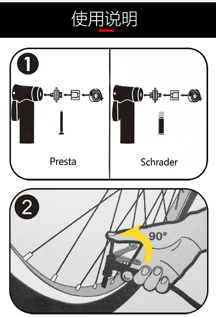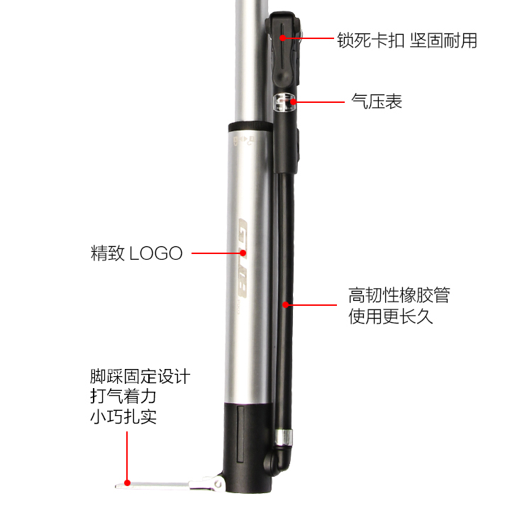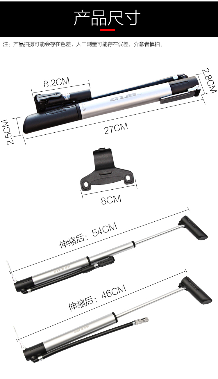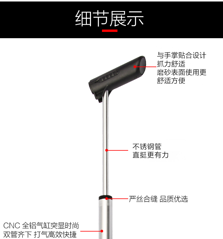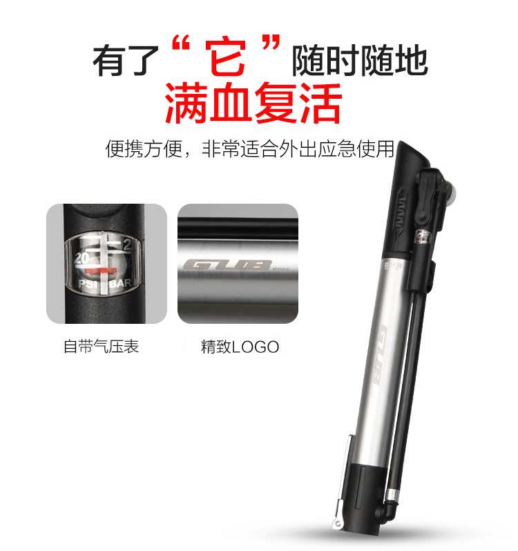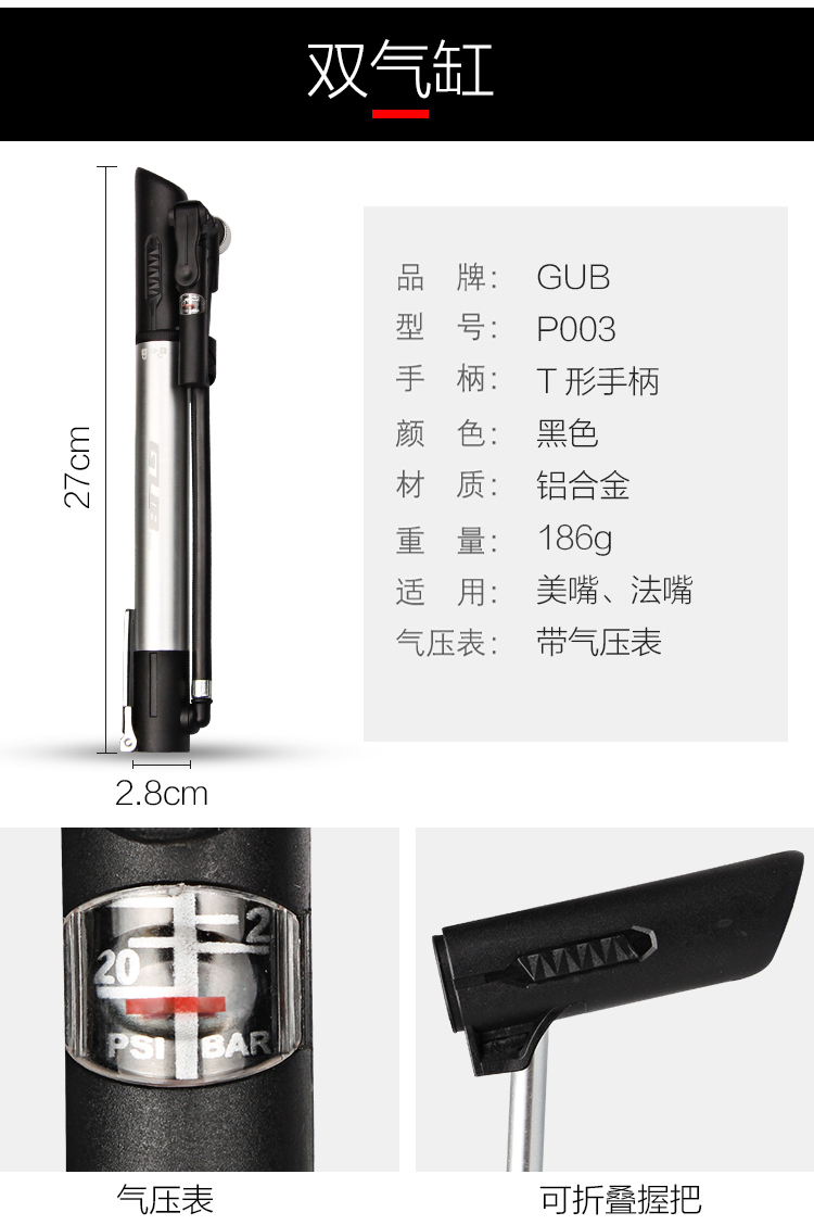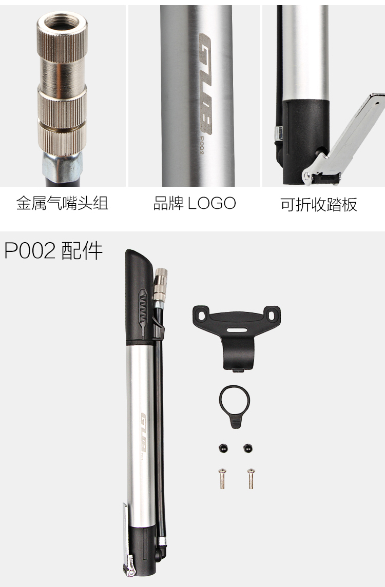 特點(diǎn):鋁合金氣缸,體積小不占地方,美嘴法嘴兼用,帶固定支架可安裝在車架上