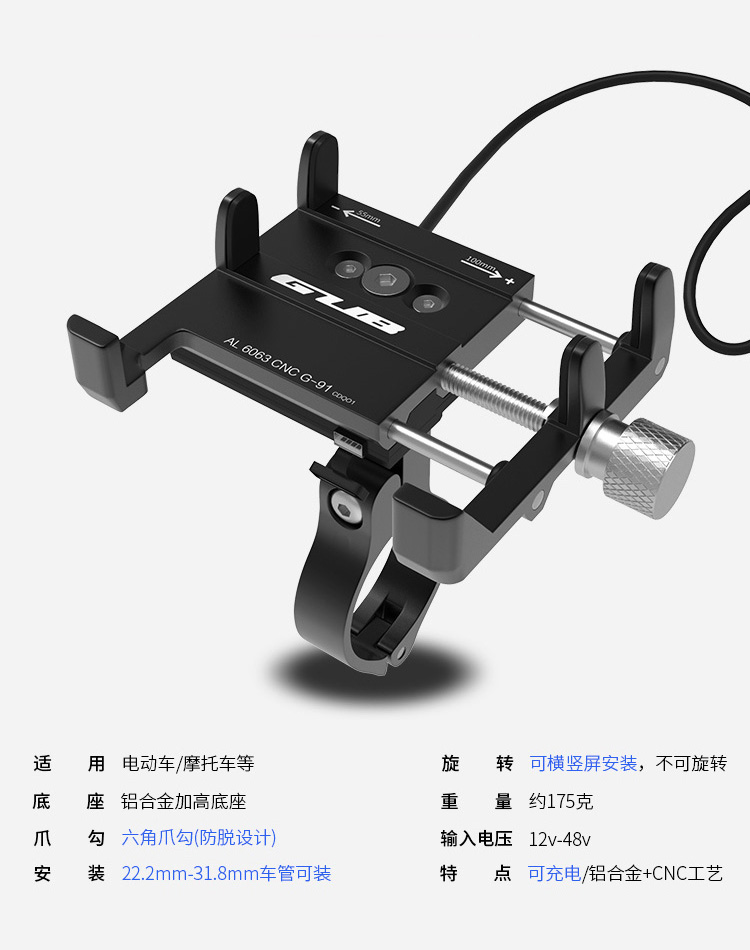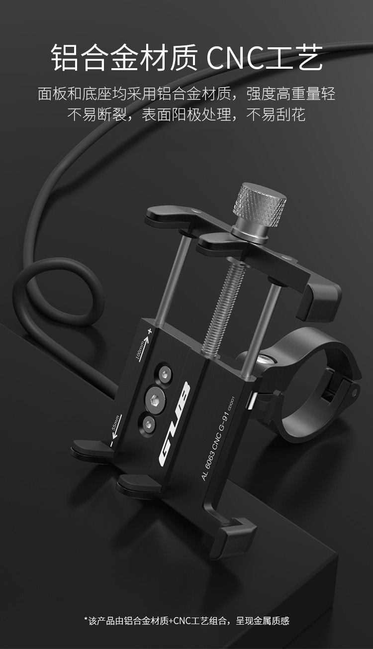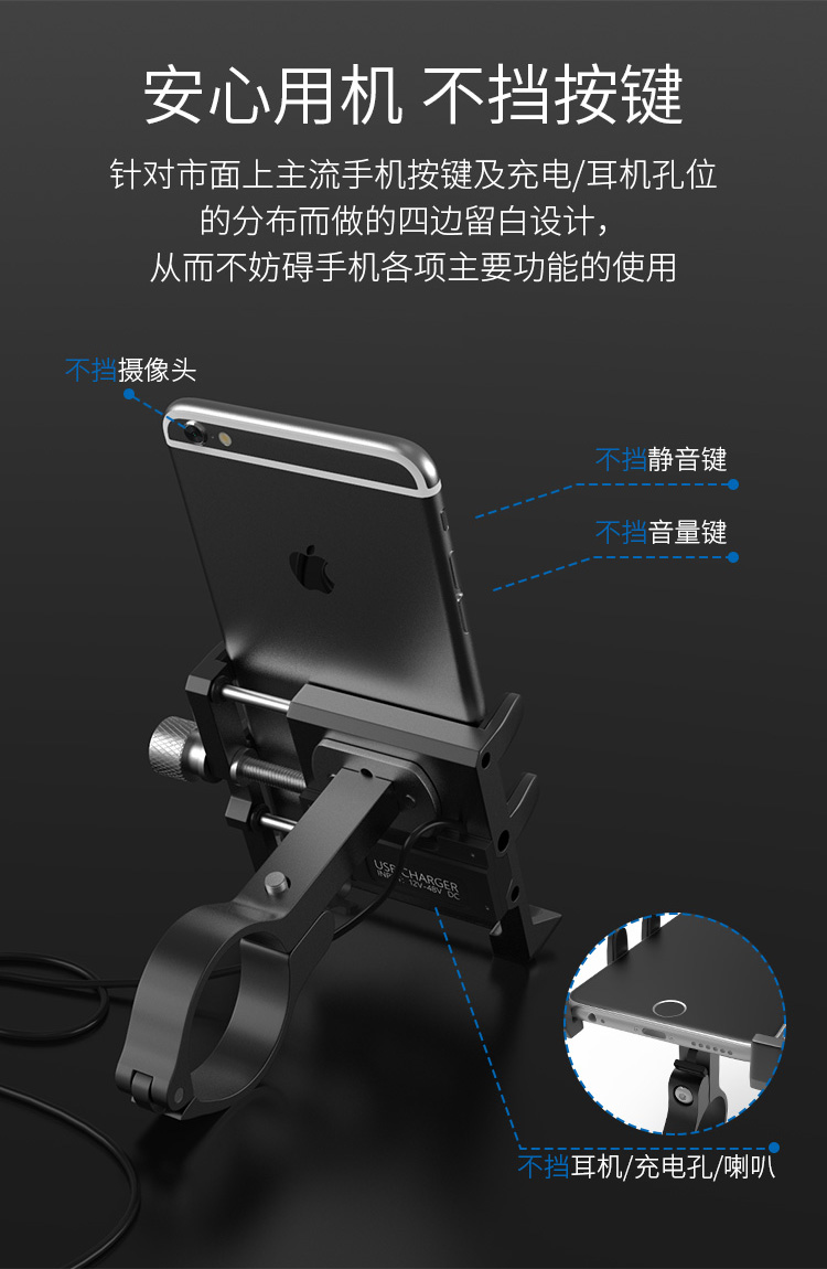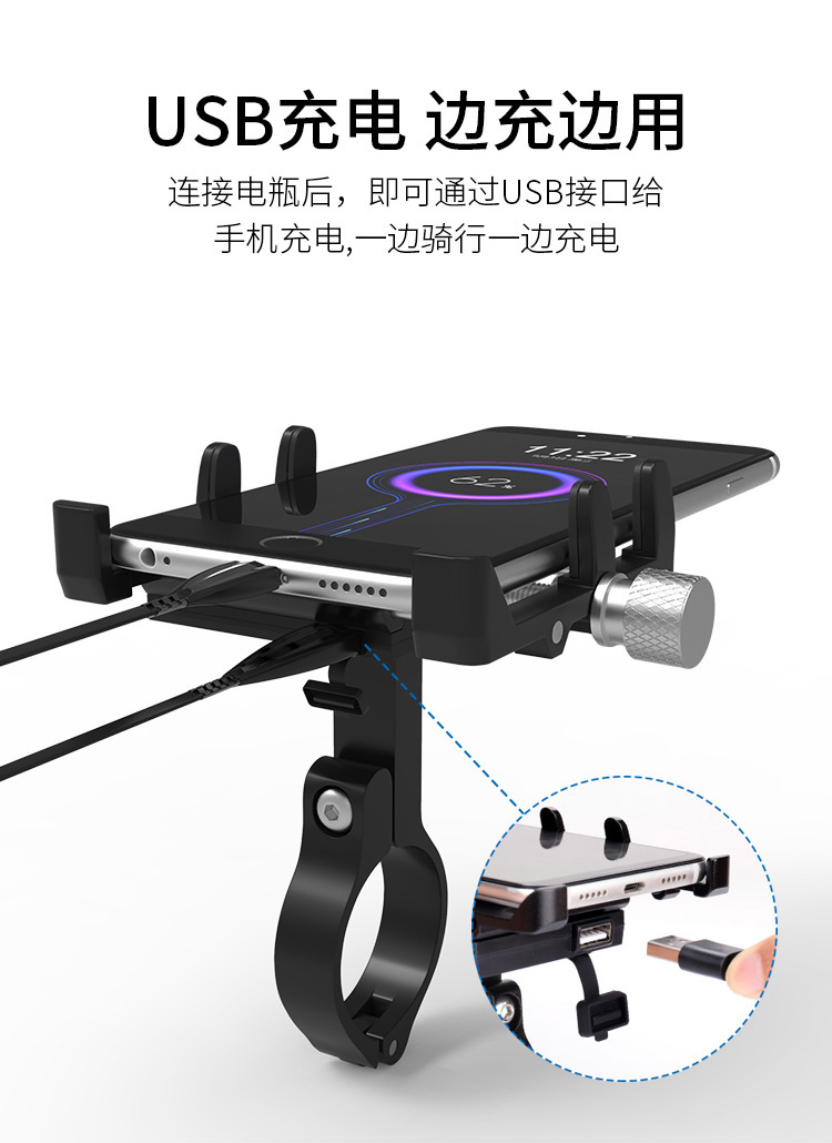 特點:全鋁合金架體,四對位加長固定部+強化底托,更標(biāo)配穩(wěn)固綁帶,高兼容性不挑手機型號,連接電瓶后可為手機充電,摩托車/電動車等都可使用!