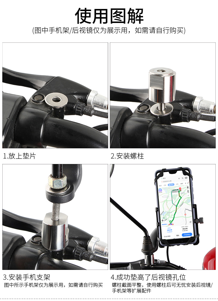 簡介:此配件為后視鏡輔助配件,采用不銹鋼材質,耐用不生銹,用于摩托車/電動車后視鏡孔位的擴展,起到墊高或更好適配的作用。