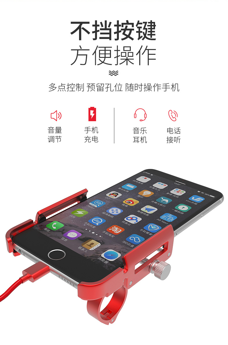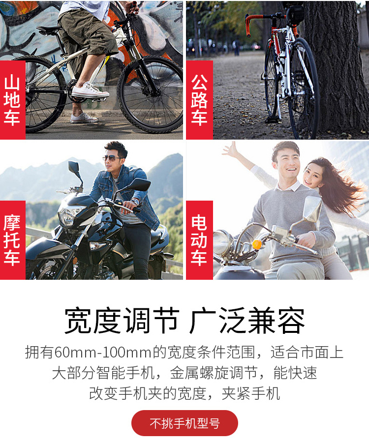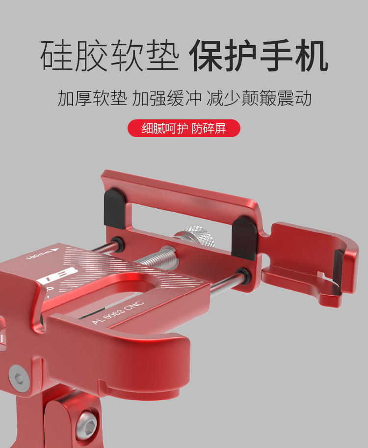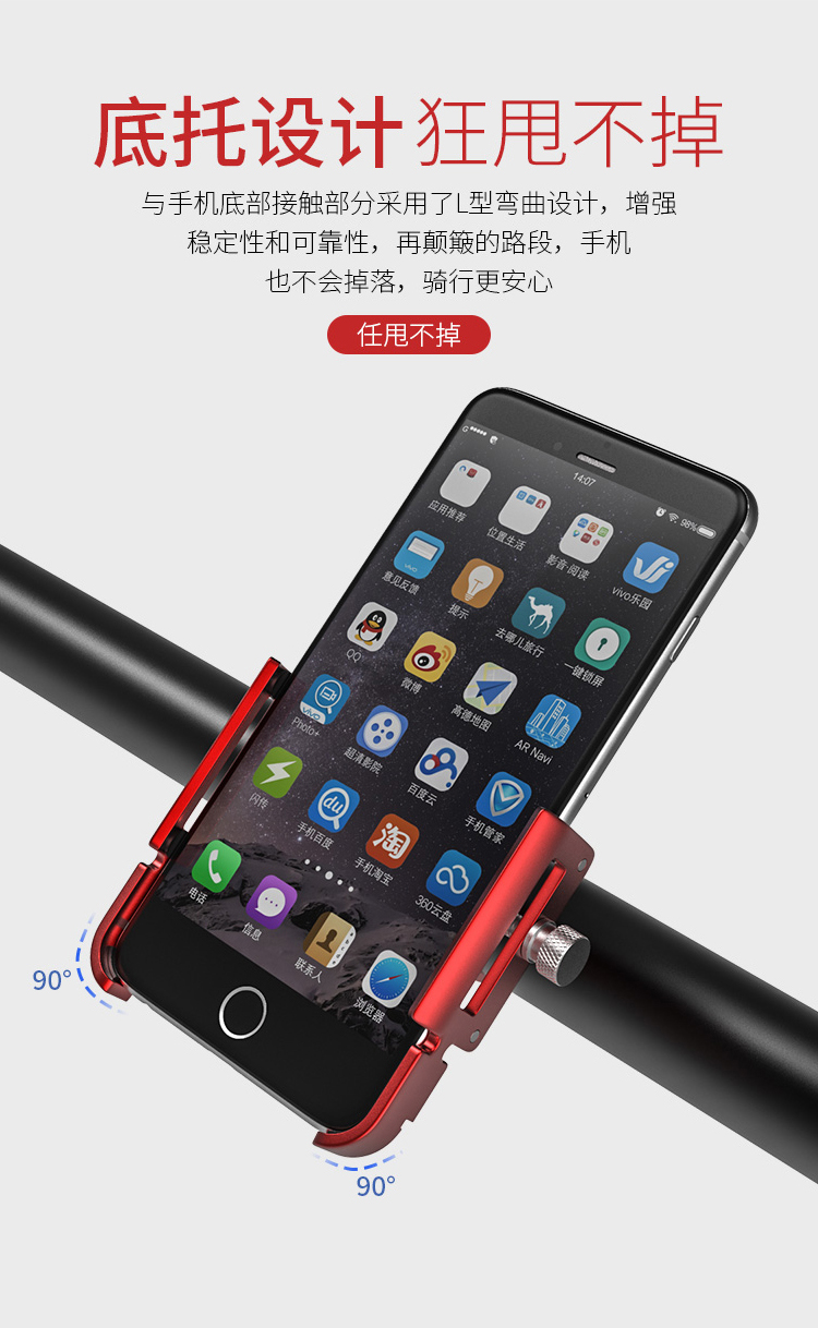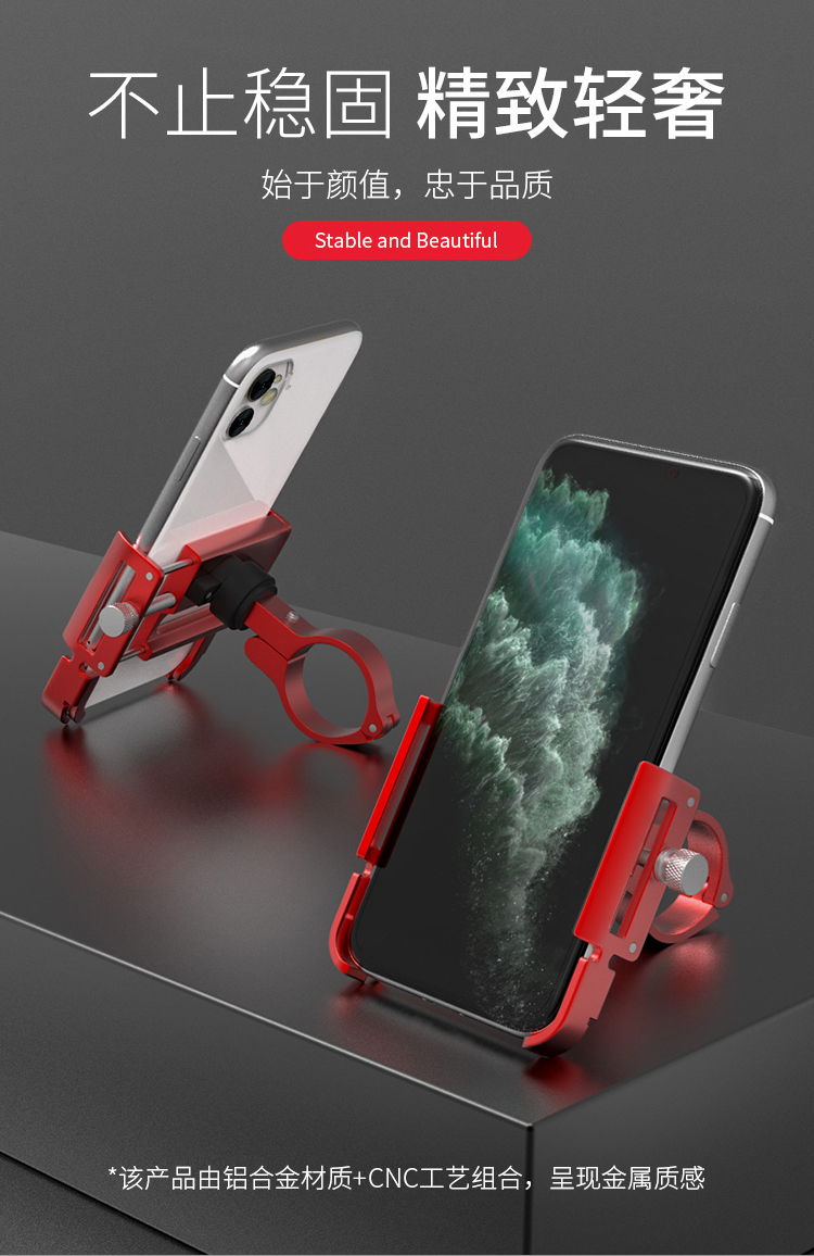 特點:鋁合金架體,高兼容性不挑手機型號,自行車、電動車等都可使用!