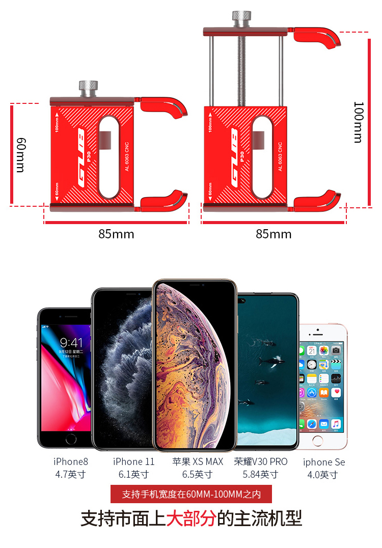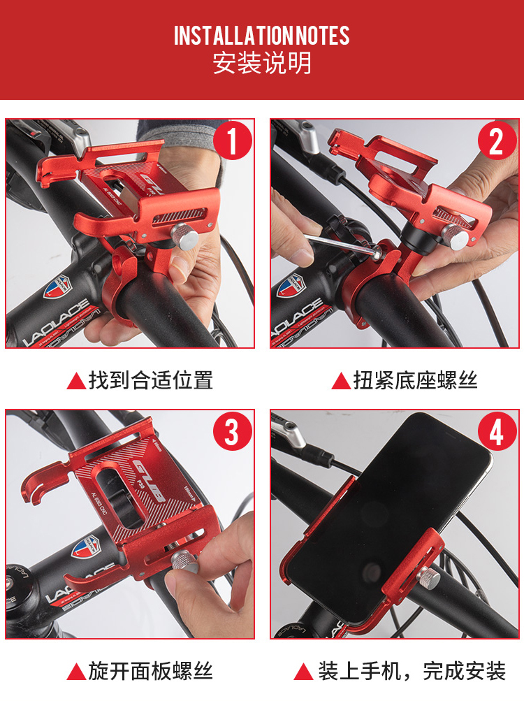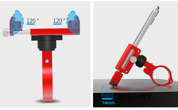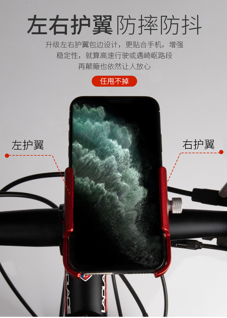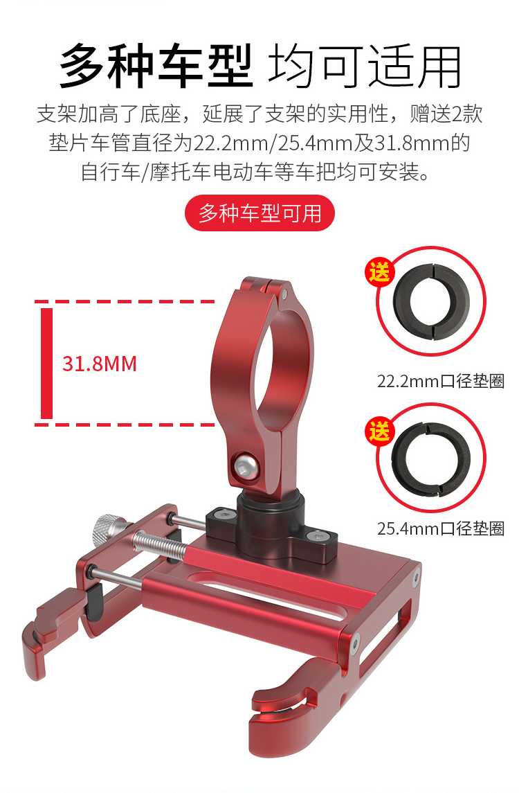 特點:鋁合金架體,高兼容性不挑手機型號,自行車、電動車等都可使用!
