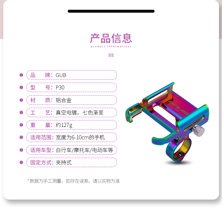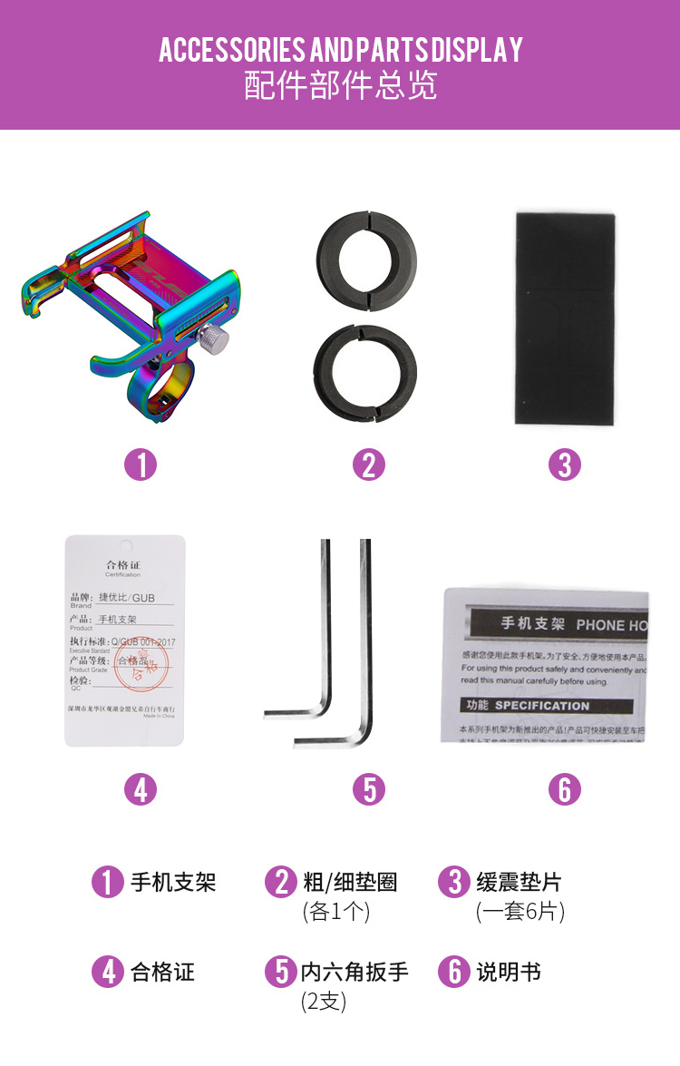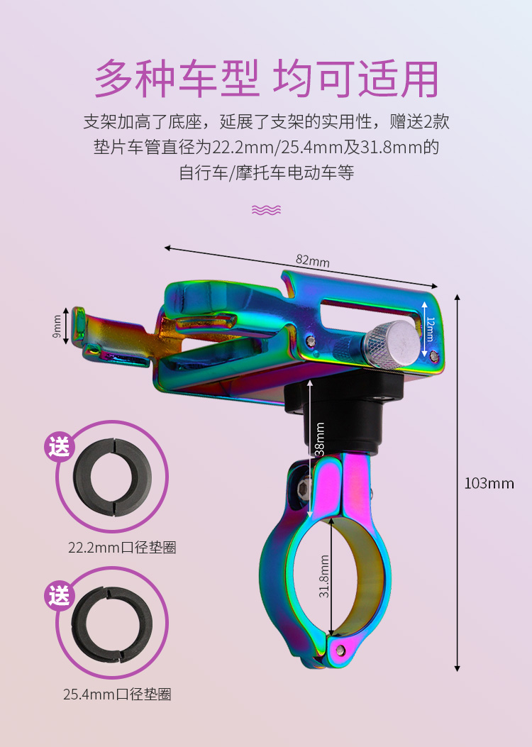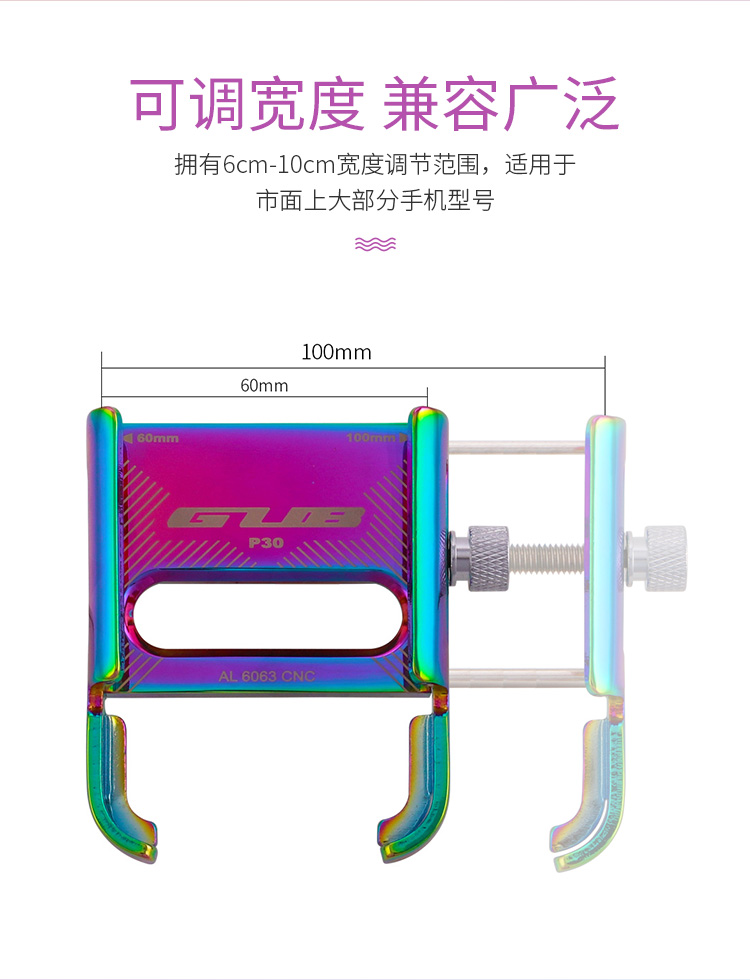 特點:鋁合金架體,七彩電鍍彰顯個性,高兼容性不挑手機型號,自行車、電動車等都可使用!