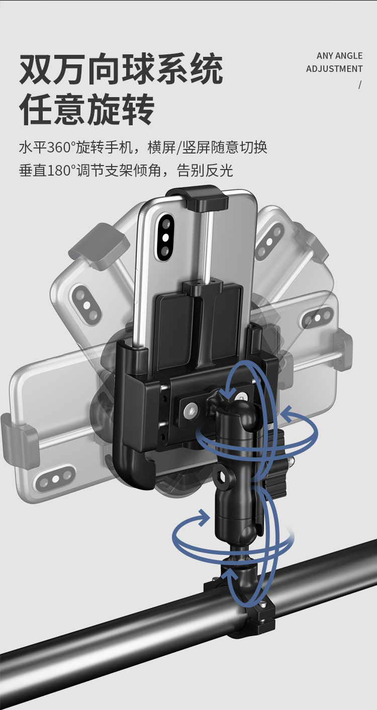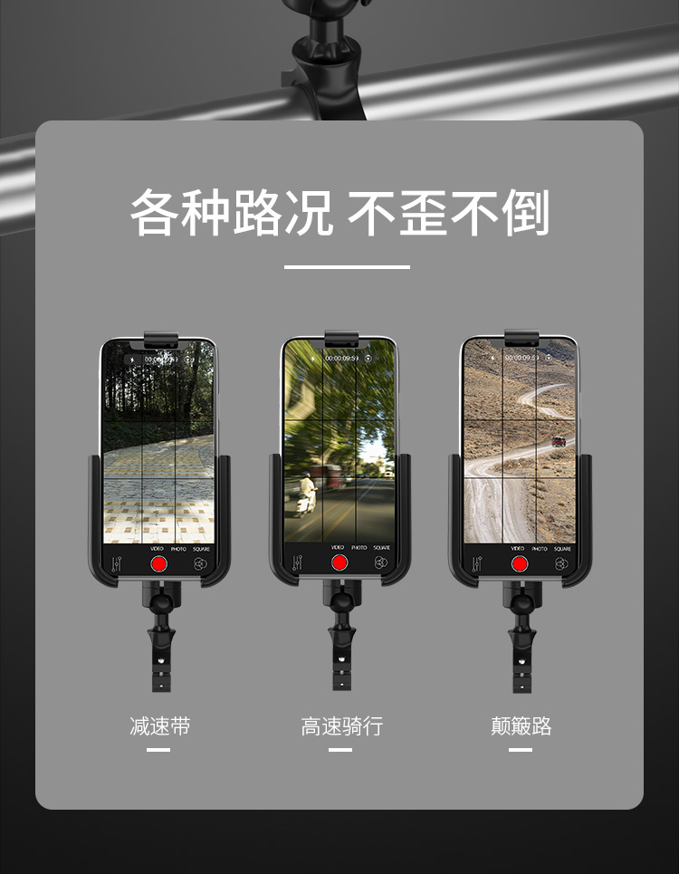 特點:鋁合金架體,高兼容性不挑手機型號,摩托車、電動車等都可使用,四面環(huán)繞固定,夾手機更牢固,快速取放省時省力,雙萬向球旋轉(zhuǎn)系統(tǒng),滿足多場景使用需求。