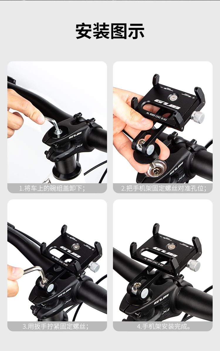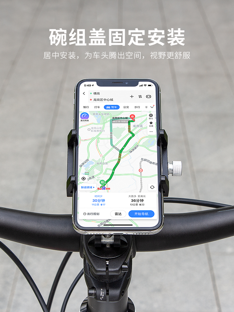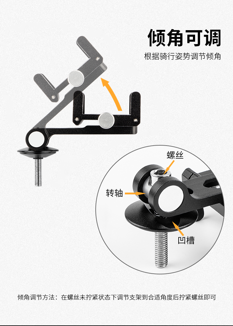 特點(diǎn):全鋁架體,碗組蓋固定式安裝,節(jié)省車頭空間,可調(diào)傾角設(shè)計(jì),根據(jù)騎行姿勢選擇合適角度,螺旋式固定手機(jī),加長固定爪,穩(wěn)定不掉。