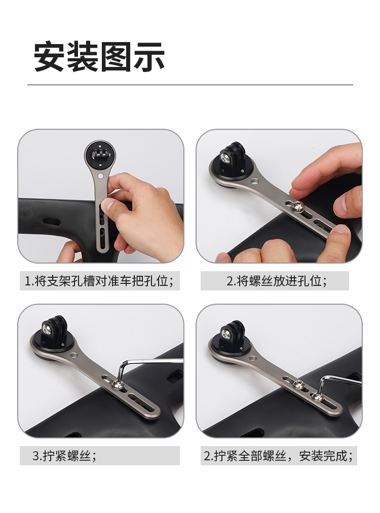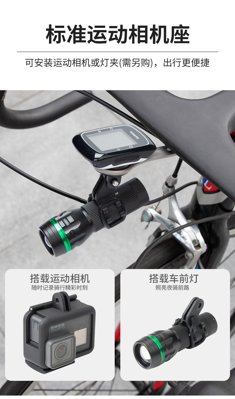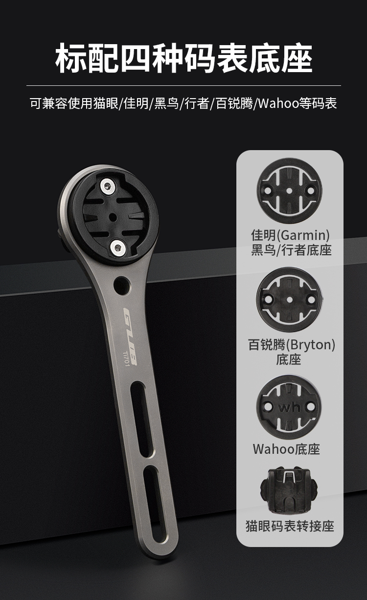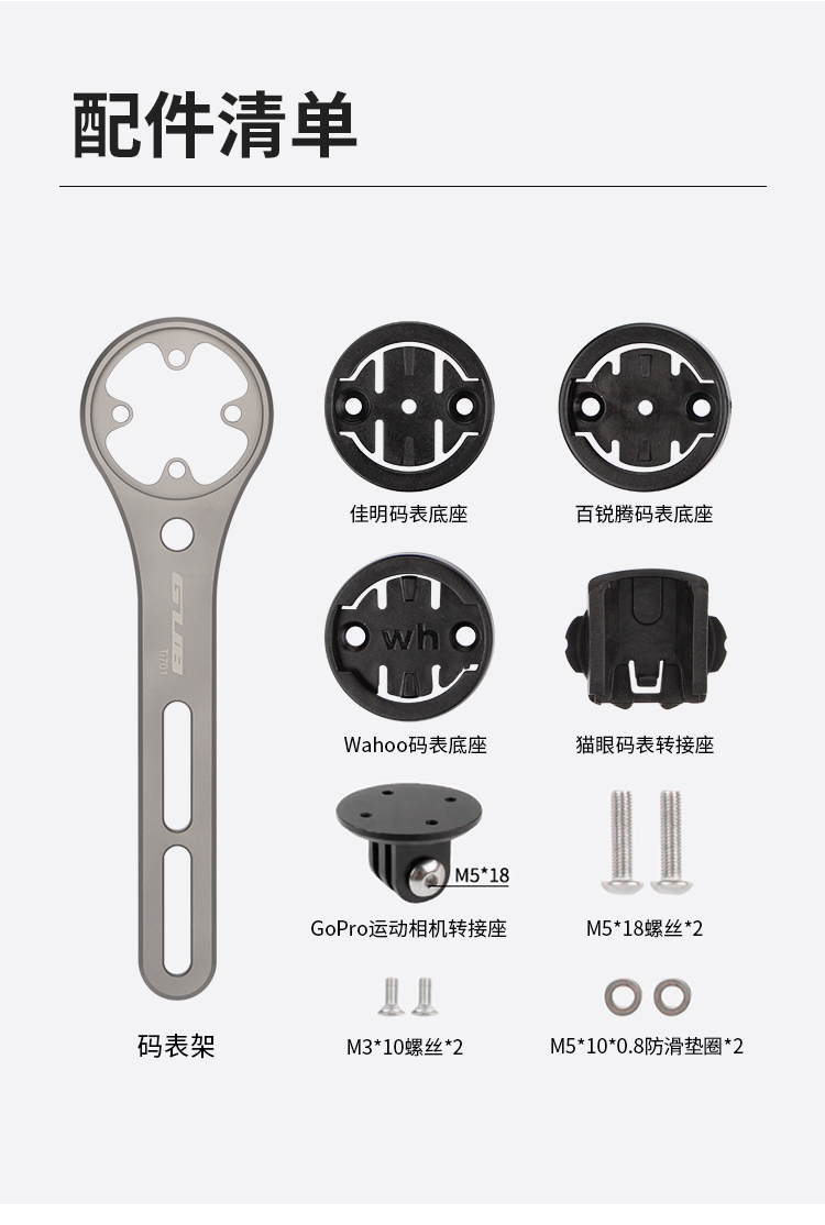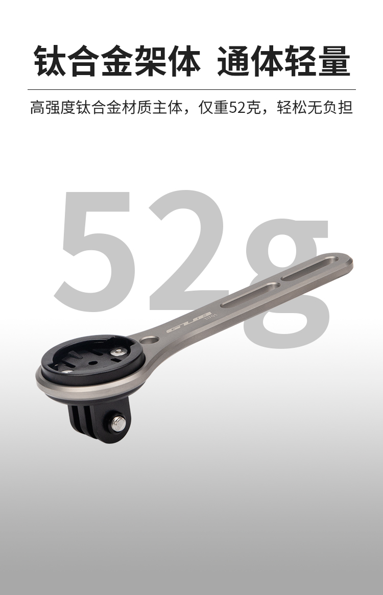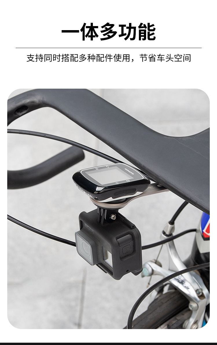 特點(diǎn):鈦合金架體,居中安裝節(jié)省空間(一體把專用),兼容多種碼表,標(biāo)配運(yùn)動(dòng)相機(jī)接座,可擴(kuò)展使用運(yùn)動(dòng)相機(jī)等配件